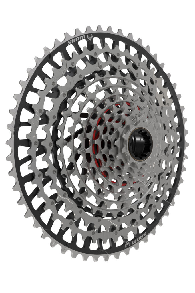 Hier hat sich SRAM auch etwas ganz Besonderes einfallen lassen: Im Gegensatz zu den bislang üblichen Steighilfen, die sich über alle Ritzel hinweg verteilt haben, gibt es auf der Transmission Kassette exakt vorgezeichnete Schaltgassen, die ausschließlich genutzt werden. Möglich macht‘s die Programmierung des elektrischen Schaltwerks. Der Schaltvorgang wird automatisch erst dann ausgeführt, wenn eine der Schaltgassen quasi „vorbei kommt“. Schaltet der Fahrer mehrere Gänge schnell hintereinander, reagiert das Schaltwerk stets an der richtigen Stelle, gegebenenfalls mit minimaler Verzögerung. Dafür kann der Fahrer die Kette ohne Unterbrechung auf Zug halten. Ein Vorteil an Steigungen.