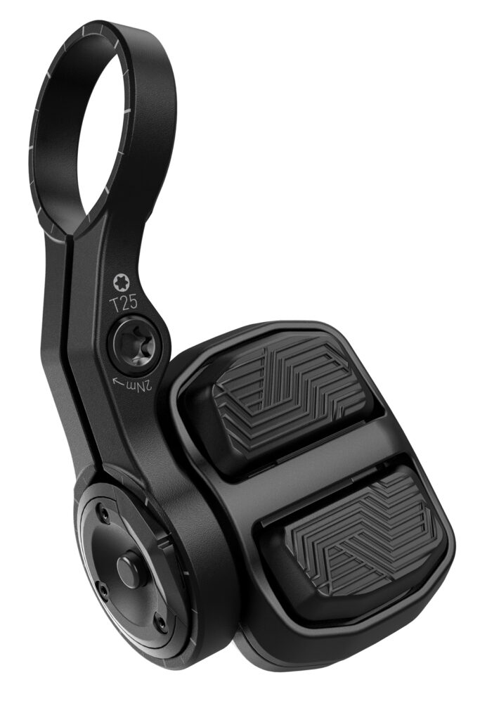 Herkömmliche Schalthebel waren gestern! Das Schaltwerk erhält seine Befehle über Funk von zwei minimalistischen Tastern, genannt Pods. Die Einheit sitzt an einem kleinen Ausleger mit Lenkerschelle, der sich vielfach verstellen lässt. So findet jeder die richtige Position für seinen Daumen. An den Pods gibt es außerdem eine Micro-Adjust-Taste, mit deren Hilfe sich die Stellung des Schaltwerks in 14 Stufen fein justieren lässt. Dies muss in der Regel aber nur einmal beim Erst-Setup erledigt werden.