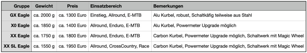 T-Type – An diesem Kürzel erkennst du in den Specs eines Bikes, dass es sich bei der betreffenden Komponente, beispielsweise dem Schaltwerk, um ein Transmission Schaltwerk handelt. Und wenn von einer Gruppe die Rede ist, sind im Fall der Transmission die Komponenten Schaltwerk, Kassette, Kette, Schalthebel und Kurbel gemeint. Alle Eagle Transmission Gruppen arbeiten elektrisch/drahtlos und stellen 1 x 12 Gänge zur Verfügung. Die Hierarchie verläuft wie üblich von preiswert nach teuer. Die Unterschiede bei der Performance sind über alle Gruppen hinweg marginal. Das heißt, die GX Eagle Transmission Schaltung wechselt die Gänge genauso perfekt wie eine deutlich teurere XX Eagle. Sehr wohl spürbar sind hingegen die Unterschiede bei den Gewichten. Beispiel: Eine XX SL Eagle Gruppe wiegt unterm Strich rund 500 Gramm weniger als eine GX Eagle.