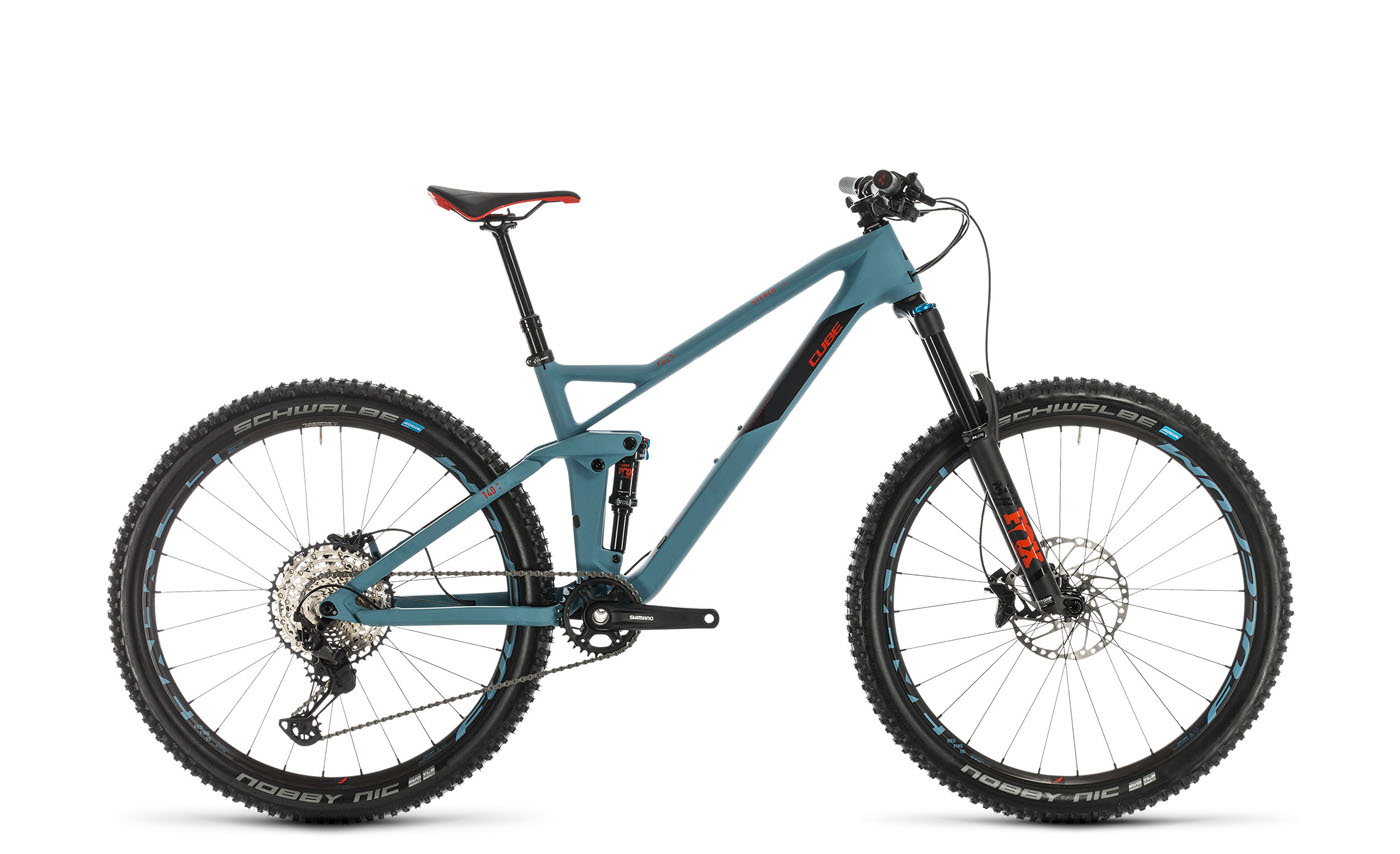 Ein Long-Travel-Enduro mit 29-Zoll-Laufrädern ist durchaus etwas Besonderes. Mit dieser Maschine ist keine Abfahrt mehr zu steil und kein Trail zu verblockt. Der Aluminium-Rahmen wartet mit einigen interessanten technischen Features auf: Zum Beispiel ist der Lenkwinkel mit Hilfe von drehbaren Lagersitzen zwischen 64,4 und 65 Grad verstellbar. Außerdem lässt sich die Hinterbau-Charakteristik an Stahlfeder- oder Luftdämpfer anpassen: Dazu kommt an beiden Dämpferaufhängungen ein drehbarer Flip-Chip zum Einsatz, der den Hebel verändert. Die Agile-Trail-Geometrie mit kurzen Kettenstreben und langem Reach macht selbst diesen Boliden unerwartet wendig. Und mit rund 15 Kilo ist das Gewicht des neuen Fullys mehr als akzeptabel. Drei Modellvarianten stehen zur Wahl, alle mit Aluminium-Rahmen. Das abgebildete Einstiegsmodell CUBE Stereo kommt mit Fox Fahrwerk, Sram GX Eagle 1×12 Schaltung und Sram Code R Scheibenbremsen für verlockende 2999 Euro. Darüber liegen das Stereo 170 TM (3599 Euro) und das CUBE Stereo (3999 Euro).