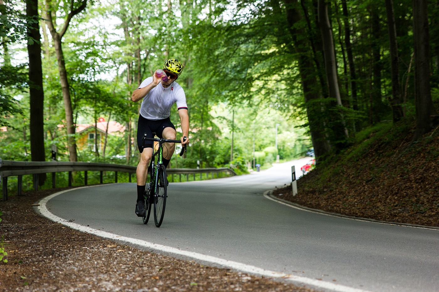 In dehydriertem Zustand kann keine Osmose im Verdauungssystem stattfinden, und die zugeführten Kohlenhydrate werden nicht vom Körper absorbiert. Reines Wasser als Flüssigkeitslieferant kann bei Menschen, die stark schwitzen, sogar einen negativen Effekt hervorrufen, denn das Wasser spült wichtige Salze aus dem Körper. Elektrolytmischungen im Getränk halten den Salzgehalt im Körper auf gutem Niveau und helfen auch, Krämpfe nach der Tour zu vermeiden. Alternativ bietet sich auch eine Mischung aus 40% naturtrübem Apfelsaft und 60% Wasser an, denn mit diesem Verhältnis ist das Getränk isoton und kann gut vom Körper aufgenommen werden.