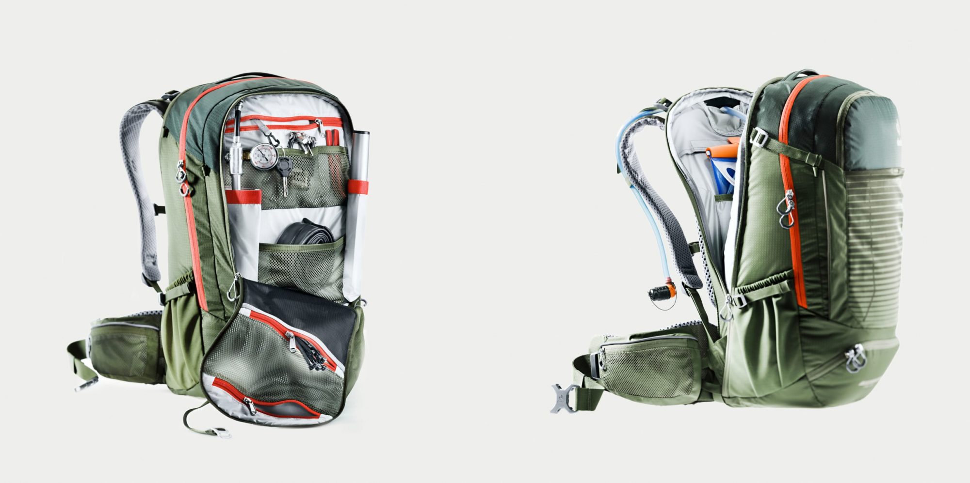 Regelmäßiges Trinken gehört beim Radfahren zum Pflichtprogramm, besonders in den Alpen an den langen Anstiegen! Ein bis zwei Liter Flüssigkeit pro zwei Stunden sollte man schon zu sich nehmen. Wie es sich für einen modernen Bike-Rucksack gehört, besitzt der Deuter Trans Alpine Pro ein extra Fach für ein Trinksystem (z. B. Camelbak). Es sitzt unmittelbar am Rücken, der Ausgang für den Schlauch befindet sich oben in der Mitte. Allerdings sollte man sich fragen, wie intensiv man ein Trinksystem nutzt. Schließlich wiegen zwei Liter Flüssigkeit zwei Kilo, die den Rücken zusätzlich belasten. Wenn dein Rahmen also Platz für einen oder zwei Flaschenhalter bietet, kannst du dieses Gewicht ans Bike verlagern. Zudem ist die Wasserversorgung in den Alpen in der Regel gesichert, so dass man alle Reservoirs regelmäßig nachfüllen kann. Besondere Erwähnung verdient auch das Werkzeugfach am neuen Trans Alpine Pro. Ausgestattet mit zahlreichen Halterungen und Netzen sitzt es leicht zugänglich hinten am Rucksack. Doch auch hier gilt: Jedes Werkzeug und Ersatzteil, das sich am Bike befestigen lässt, entlastet den Rücken! Zum Beispiel passen Ersatzschlauch, Reifenheber und Flickzeug in ein Täschchen unter dem Sattel. Und die Pumpe kann in einer Klemme am Flaschenhalter sitzen.
