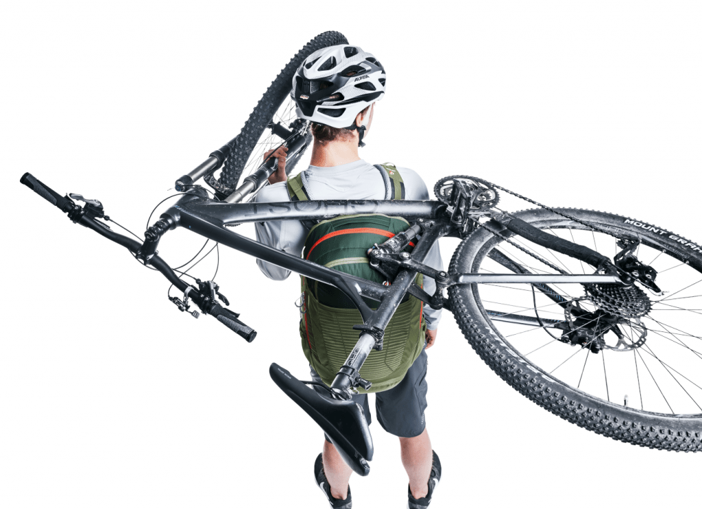 - Gummierte Träger im Schulterbereich zum besseren Schultern des Bikes