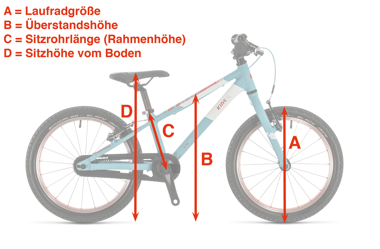 Bei Kinderrädern definiert sich die Größe ausschließlich über den Durchmesser der Räder. Im Unterschied zu Erwachsenenbikes stehen bei Kinderrad-Modellen verschiedene Rahmengrößen bei ein und derselben Radgröße NICHT zur Wahl. Beispiel: Wenn das Kind über sein 16-Zoll-Bike hinaus gewachsen ist, benötigt es ein Bike mit 18- oder 20-Zoll Laufrädern.