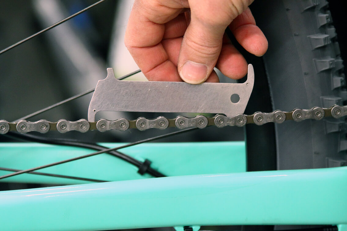 In regelmäßigen Abständen solltest du die Längung deiner Kette prüfen. Dazu bietet der Fahrrad-Fachhandel spezielle Messlehren an. Aufgrund der eingangs beschriebenen Belastung durch Antrieb und Schaltvorgänge dehnt sich jede Kette mit der Zeit. Entsprechend werden die Zähne an Ritzel und Kettenblättern ausgearbeitet. Wartet man zu lange mit dem Tausch einer verschlissenen Kette, dann harmonieren die Zahnprofile nicht mehr mit einer neuen Kette: Sie springt bei Belastung über! Checkt man jedoch die Kette regelmäßig auf Längung und tauscht sie aus, wenn die Messlehre Alarm schlägt, dann kann man den Tausch weiterer und teurer Antriebskomponenten hinauszögern. Eine regelmäßig gepflegte Kette hält bis zu 3000 Kilometer durch!