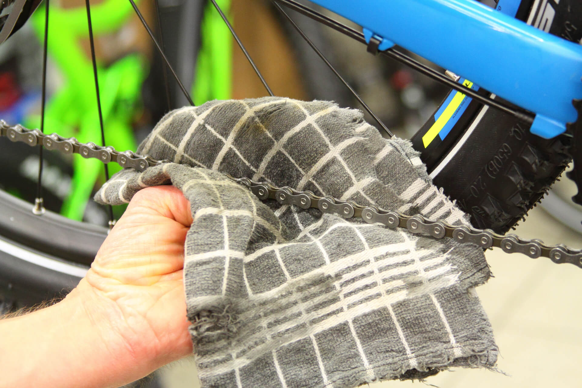 • Bei (leichter) Nässe die Kette zunächst trocknen, indem du sie beim Rückwärtskurbeln durch einen Lappen ziehst. Bei trocken-staubiger Kette sollte der Lappen mit etwas Ketten-Öl benetzt sein. Damit wird die Kette äußerlich gereinigt.