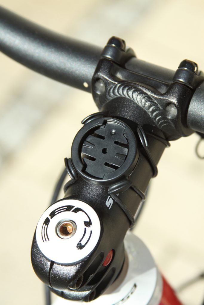 Eine Halterung fürs Fahrrad ist im Lieferumfang enthalten. Sie besteht aus zwei Grundträgern mit Bajonettverschluss und verschieden langen Gummiringen. Damit lässt sich der Edge Explore wahlweise am Lenker oder in der Mitte auf dem Vorbau platzieren. Das ist im Handumdrehen erledigt und hält das Gerät zufriedenstellend in Position. Optional bietet Garmin eine (stabilere) Aero-Halterung an. Zur Halterung zählt noch ein Band, womit man den Edge Explore zusätzlich gegen Verlieren am Cockpit sichern kann.