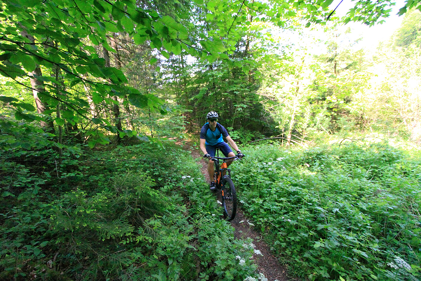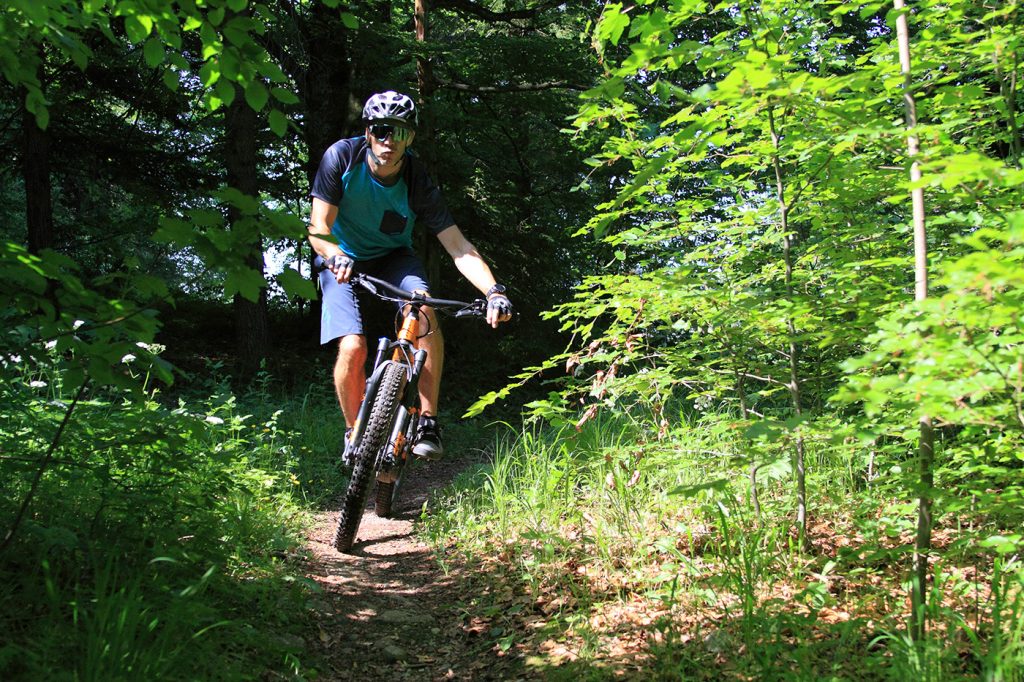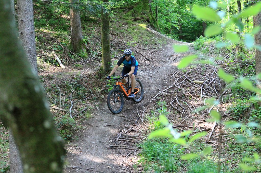 Bevor es los geht darf man nicht vergessen, die blauen Hebel an Gabel und Dämpfer in die Stellung „Open“ zu bringen. Damit spricht das Fahrwerk sensibel an und es steht der volle Federweg zur Verfügung. Man spürt sofort: Bergab ist das Trance E+ in seinem Element. Dank des tiefen Schwerpunktes liegt das Fahrwerk unglaublich satt auf dem Trail. Bockige Wurzelpassagen werden einfach glatt gebügelt. Einmal mehr spielen die fetten Reifen ihren Komfort-Bonus aus. Der breite Lenker lässt dich stets die volle Kontrolle über die gewählte Fahrlinie behalten. Und wenns knifflig wird kannst du mit einem Hebeldruck die Sattelstütze versenken. Die Bremsen beißen energisch zu, es kommt nie Zweifel daran auf, rechtzeitig zum Stehen zu kommen. Einziger Kritikpunkt auf steilen Bergab-Passagen bleibt die etwas niedrige Front, geschuldet dem kurzen Steuerrohr des Rahmens.