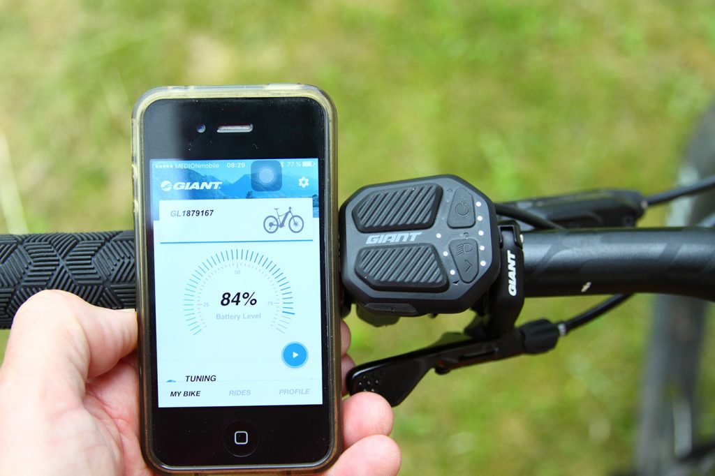 Laut Aussage von Giant ist das spartanische Bedienteil bewusst gewählt worden, um nicht vom Wesentlichen abzulenken – nämlich dem Fahrspaß auf dem Trail! Und damit haben die Entwickler gar nicht so unrecht! Mehr braucht man im Gelände nämlich nicht. Und wer zum Beispiel den Akku Ladestand ganz genau wissen will, schaut zwischendurch mal auf sein Smartphone. Wermutstropfen: Über die Rest-Reichweite informiert ebenfalls nur die App. Nach einigen Touren muss ich jedoch sagen, dass man für die Reichweite mit der Zeit ein ganz gutes Gefühl entwickelt. Tipp: Einen einfachen Bike-Computer montieren, der die nötigsten Tripdaten wie Fahrzeit und Distanz anzeigt.