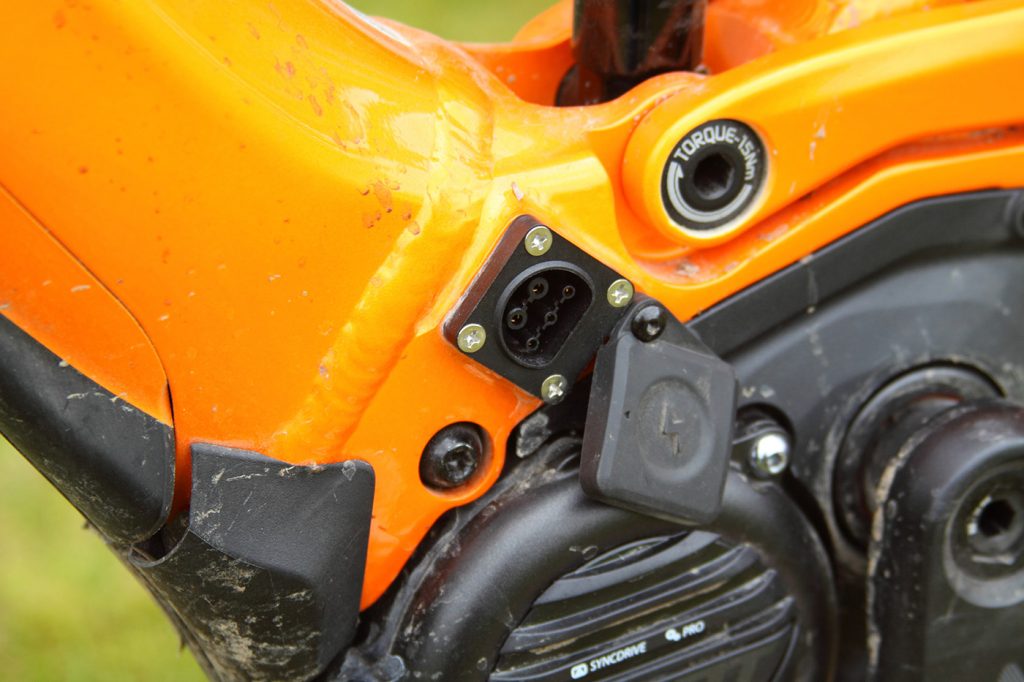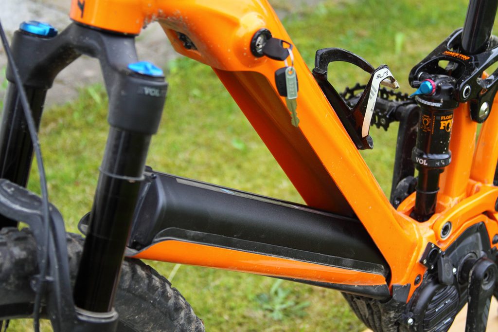 Der 500 Wattstunden Akku liegt perfekt geschützt im Unterrohr. Zum Laden kann man ihn entnehmen, muss es aber nicht. Eine Ladebuchse befindet sich auch auf der linken Seite des Rahmens, oberhalb des Motors. Gegen Diebstahl ist der Akku mit einem Schloss gesichert. Den Schlüssel benötigt man auf jeden Fall, um den Akku zu entnehmen. Zum Beispiel beim Transport des Bikes auf dem Autoträger.