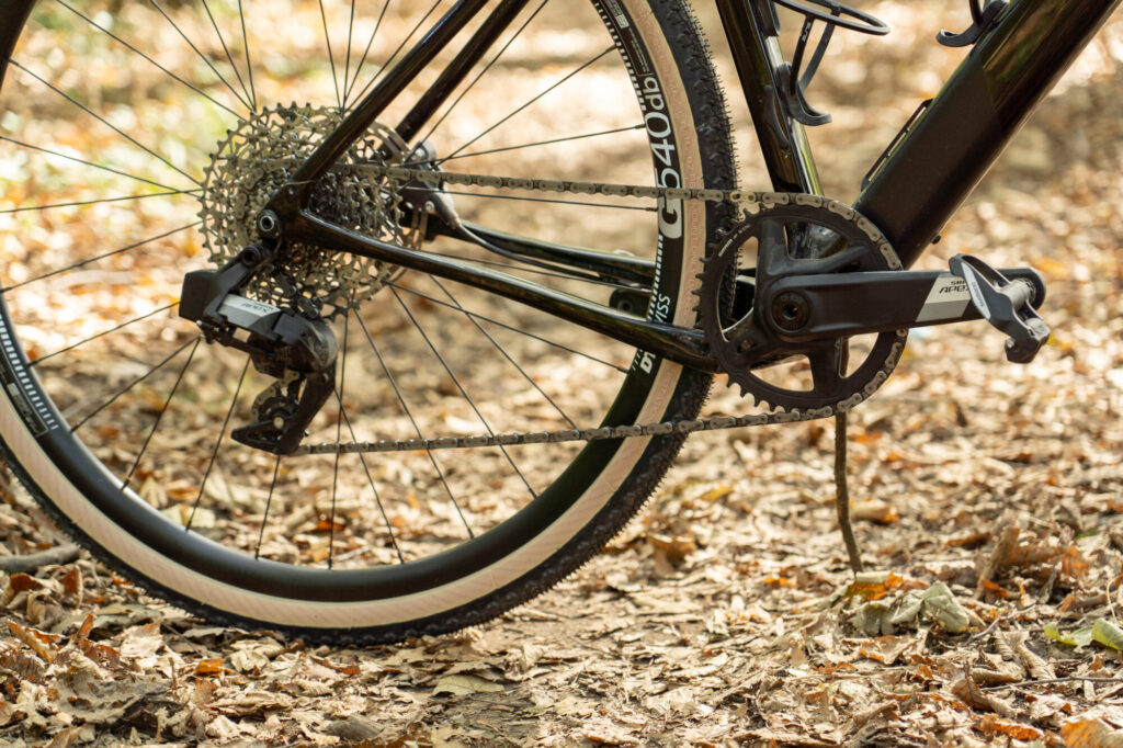 Bei unserem Testbike handelt es sich um das Topstone Carbon Apex. Wie der Name schon sagt, ist das Bike mit SRAM Apex AXS ausgestattet. Das bedeutet, wir haben die elektronische 12fach Apex verbaut. Genauer gesagt die XPLR-Version der Apex, die eine breitbandige Kassette mit einer Abstufung von 11-44 Zähnen bietet und über eine Kupplung am Schaltwerkskäfig verfügt, die den Kettenschlag reduzieren soll. Die Kurbel kommt mit einem einzelnen 40 Zähne-Kettenblatt aus. Hydraulische Scheibenbremsen sind Standard bei den AXS-Gruppen.