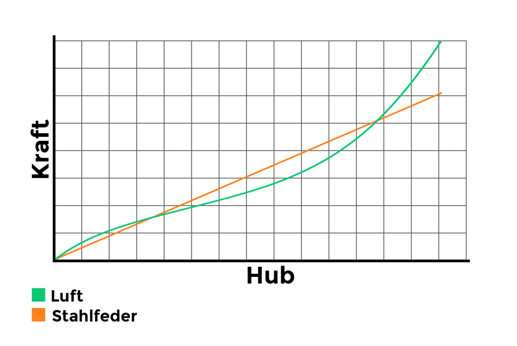 Das Experiment mit der Fahrradpumpe offenbart eine weitere Charakteristik von Luftfederungen, die die Entwickler vor Herausforderungen stellt: Am Beginn des Vorgangs lässt sich der Kolben relativ leicht gegen das Luftpolster drücken. Aber stärker mehr man die Luft komprimiert, desto mehr Widerstand setzt sie dem Druck entgegen. Bis es schließlich nicht mehr weiter geht. Diesen immer steiler werdenden Anstieg des Widerstands nennt man progressiv. Einerseits ein vorteilhafter Effekt, da er die Federung vor Durchschlägen schützt. Andererseits jedoch kann die Progression das System ab einer bestimmten Einfedertiefe unkomfortabler machen. Dazu im Anschluss mehr.