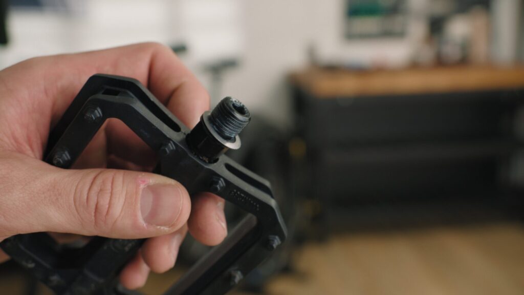 Den Pedalen liegen oft kleine Beilagscheiben bei, die Beschädigungen am Kurbelarm vermeiden sollen. In der Regel sind diese Beilagscheiben nur notwendig, wenn das Gewindeende keinen runden Abschluss besitzt, sondern die Schraubflächen des Gabelschlüssels direkt am Kurbelarm anliegen würden. Bei SRAM Kurbeln sollten die Unterlegscheiben allerdings immer verwendet werden.