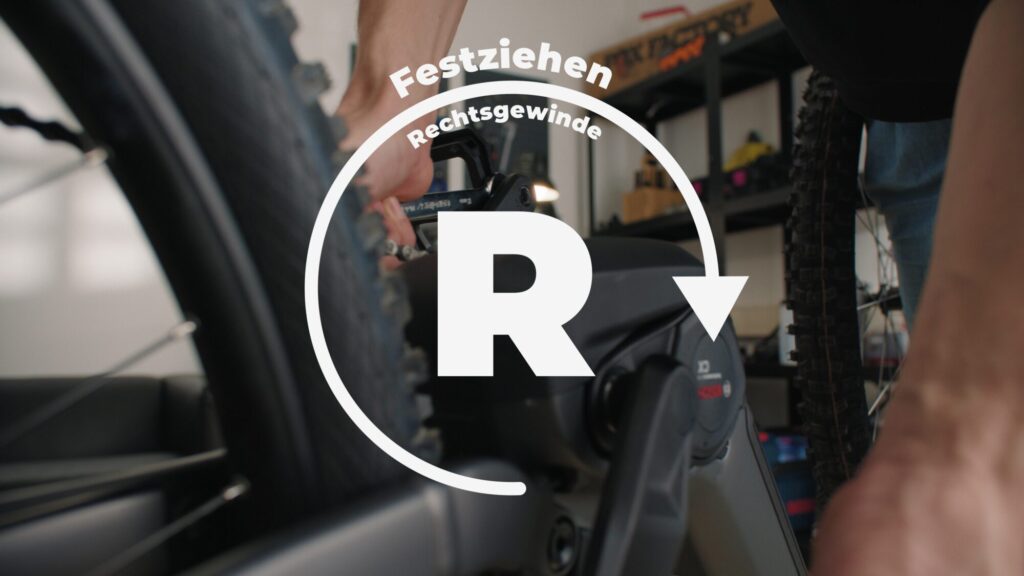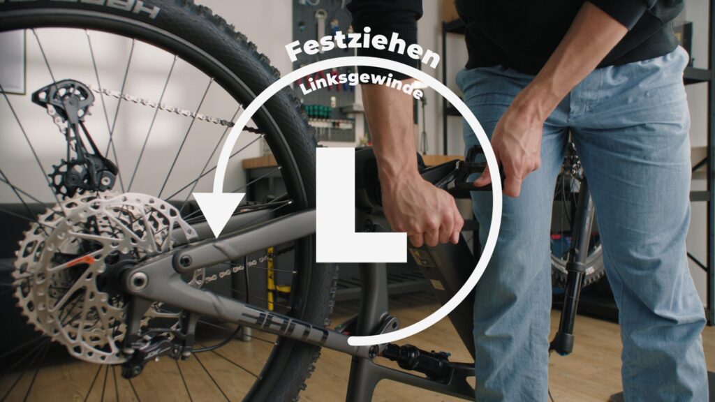 Wenn alles passt, nimmst du das Pedal für die rechte Seite und schraubst es auf der rechten Seite, der Antriebsseite, an der du das Kettenblatt und die Schaltung findest, im Uhrzeigersinn in den Kurbelarm. Auf der linken, also der nicht Antriebsseite, drehst du die Pedalachse gegen den Uhrzeigersinn in den Kurbelarm.
