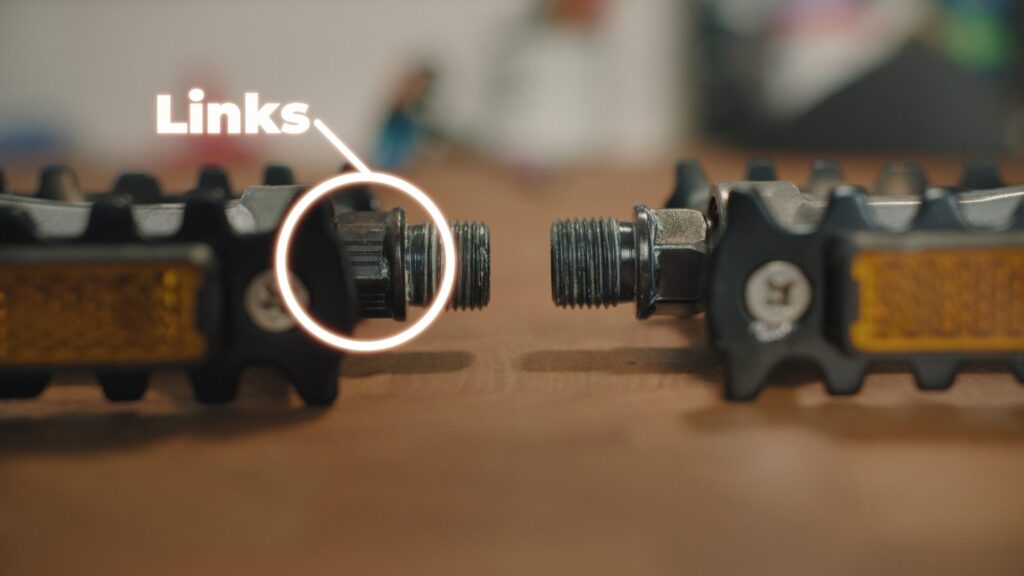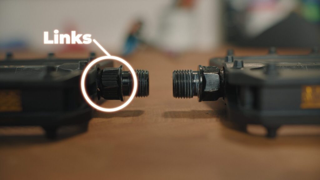 In der Regel sind die Pedale, die unseren Neurädern beiliegen, entsprechend gekennzeichnet. Solltest du jedoch keine entsprechenden Aufkleber finden können, kannst du dich an den Markierungen an den Pedalachsen orientieren. Diese Markierungen können verschiedensten Formen annehmen, wie zum Beispiel Rillen oder Kerben auf der Pedalachse. Das markierte Pedal ist jedoch immer das linke Pedal.