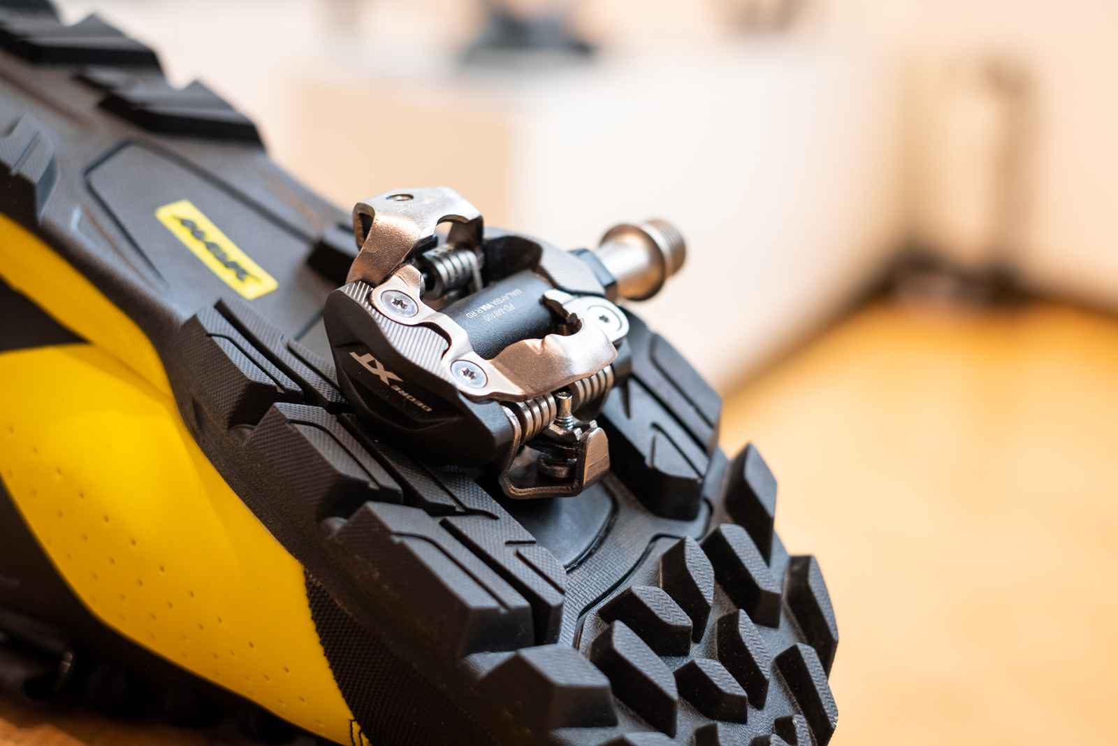 MTB Pedale wurden für den Einsatz im Gelände entwickelt und weisen deshalb Eigenschaften auf, die Rennrad Pedale nicht besitzen. Die Selbstreinigung des Pedals und die Möglichkeit mit den dazu passenden Schuhen anständig laufen zu können, sind besonders wichtig. Das kleinere, in der Schuhsohle versenkte Cleat, also die „Schuhplatte“, ermöglicht problemlos das gehen mit den Klick-Schuhen im Gelände.