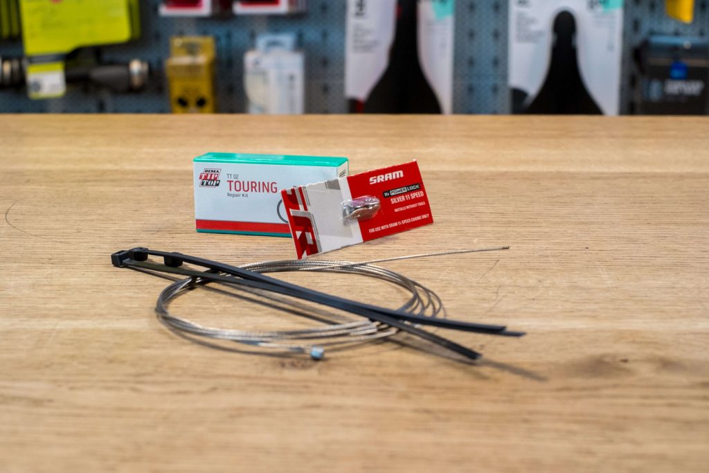 Ein oben genanntes Kettenschloss, Kabelbinder, Flickzeug und ein extra Schaltzug vervollständigen das Notfallset. Kabelbinder bändigen lockere Züge am Rad, das Flickzeug dichtet den Schlauch im Falle eines zweiten Plattens ab und der Schaltzug wird erneuert, wenn einer am Rad reißen sollte.