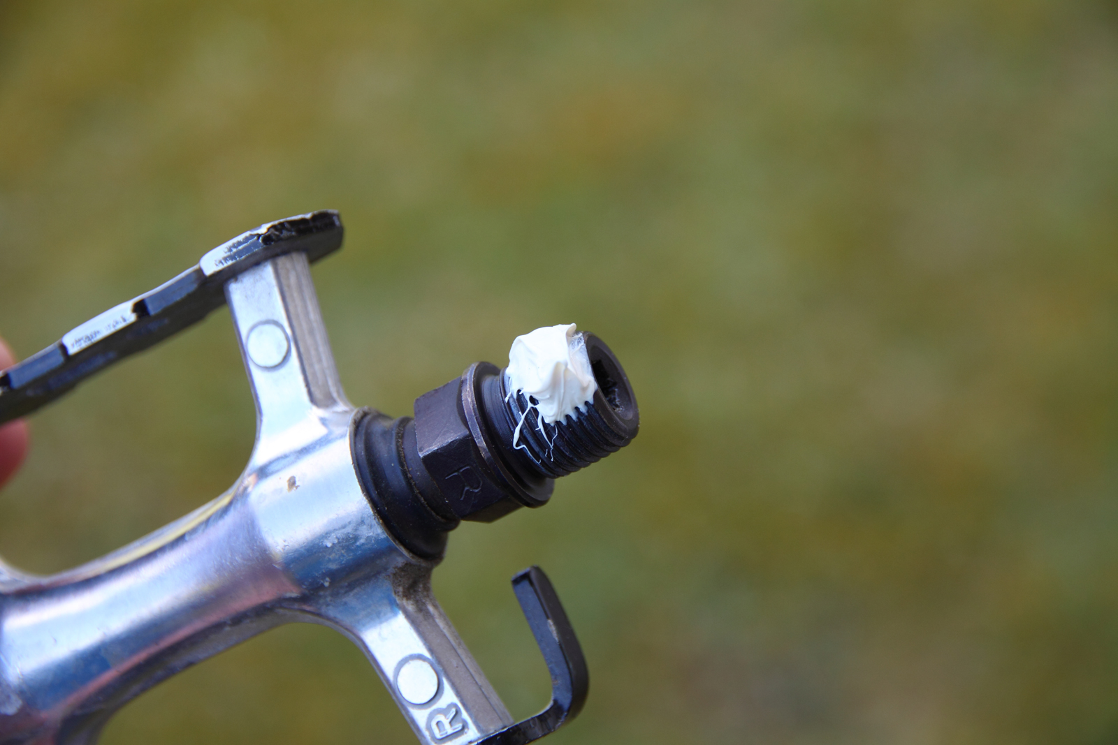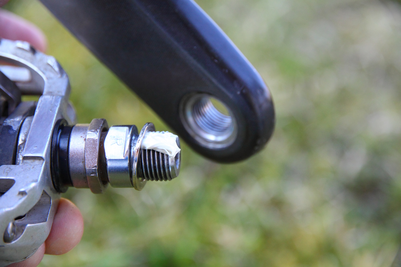 Die Pedalgewinde müssen vor dem Anschrauben der Pedale gefettet werden! Das Fett wirkt wasser-abweisend und sorgt dafür, dass sich die Pedale jederzeit mit normalem Kraftaufwand auch wieder lösen lassen. Dazu einfach ein bisschen Fett oben aufs Gewinde geben. Der Schmierstoff verteilt sich beim Anschrauben automatisch rundherum. Ausnahme: Bei Leichtbau-Pedalen mit Titan-Achsen ist statt Fett eine spezielle Titan-Montagepaste zu verwenden!