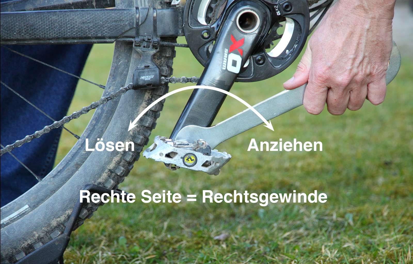 Zunächst das Pedal mit gefettetem Gewinde von Hand in die Kurbel drehen. Tipp: Schnell und leicht geht es, wenn man mit dem Inbusschlüssel von hinten durchs Kurbelgewinde dreht. Die Dreh-Richtung(en) haben wir nochmals im Bild eingezeichnet: Festziehen IM Uhrzeigersinn, lösen GEGEN den Uhzeigersinn (RECHTS-Gewinde). Sobald die Pedalachse am Anschlag ist, arbeitet man mit dem 15-mm-Pedalschlüssel weiter. Tipp: Gefühlvoll und bei Bedarf auch kraftvoll kann man anziehen (und lösen), wenn man sich über das Bike hinweg beugt und von oben her arbeitet. Dazu die Kurbel beim Anziehen auf etwa 8 Uhr stellen, beim Lösen auf 4 Uhr.
