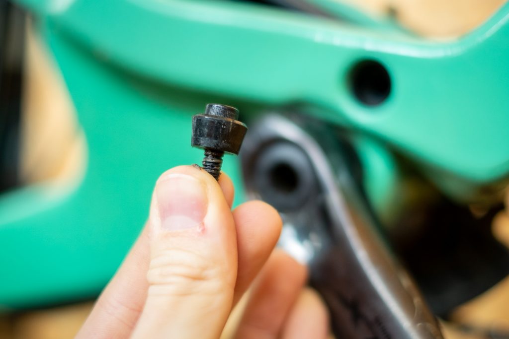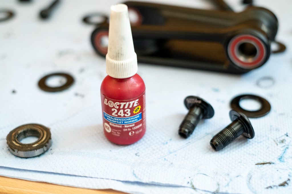 Vor dem Zusammensetzen des Hinterbaus solltest du auch die Bolzen und Schrauben noch einmal säubern und die Gewinde der Schrauben des Links am Oberrohr mit Locktide sichern. Etwas Fett auf den Bolzen hilft gegen Korrosion und verhindert, dass sich die Bolzen in den Lagern festsetzen.