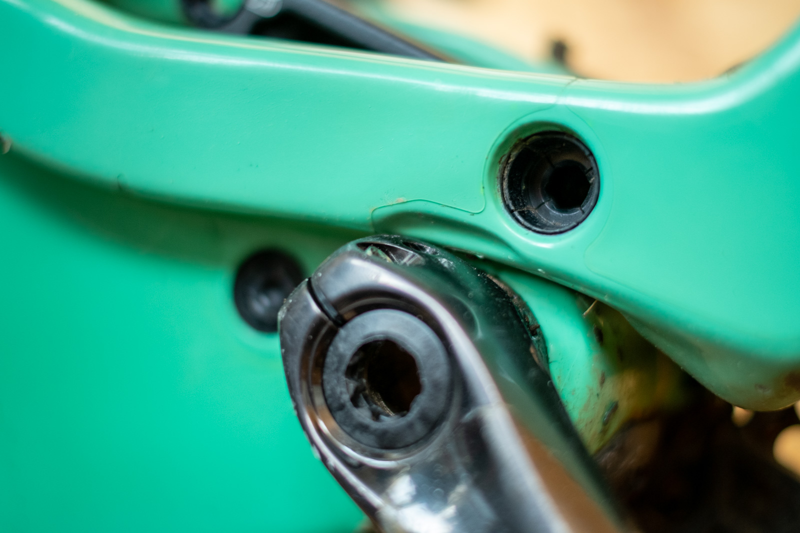 Wenn du das System der Bolzen am Hinterbau eines Santa Cruz nicht kennst, wirst du dich erst einmal wundern. Die von außen sichtbare Schraube dient nur dazu, den zylindrisch-keilförmigen Einsatz in den eigentlichen Bolzen zu drücken, um diesen zu sichern. Schraube als Erstes die 6 mm Inbus Schraube komplett heraus und entferne dann den Einsatz. Lässt sich der Einsatz nicht von Hand entfernen, kannst du diesen mithilfe von einem 6mm Inbus lösen. Jetzt kannst du den eigentlichen Bolzen mit einem 8 mm Inbus herausschrauben. Die oberen beiden Schrauben des oberen Links sind normale Schrauben und verwenden kein spezielles Sicherungssystem.