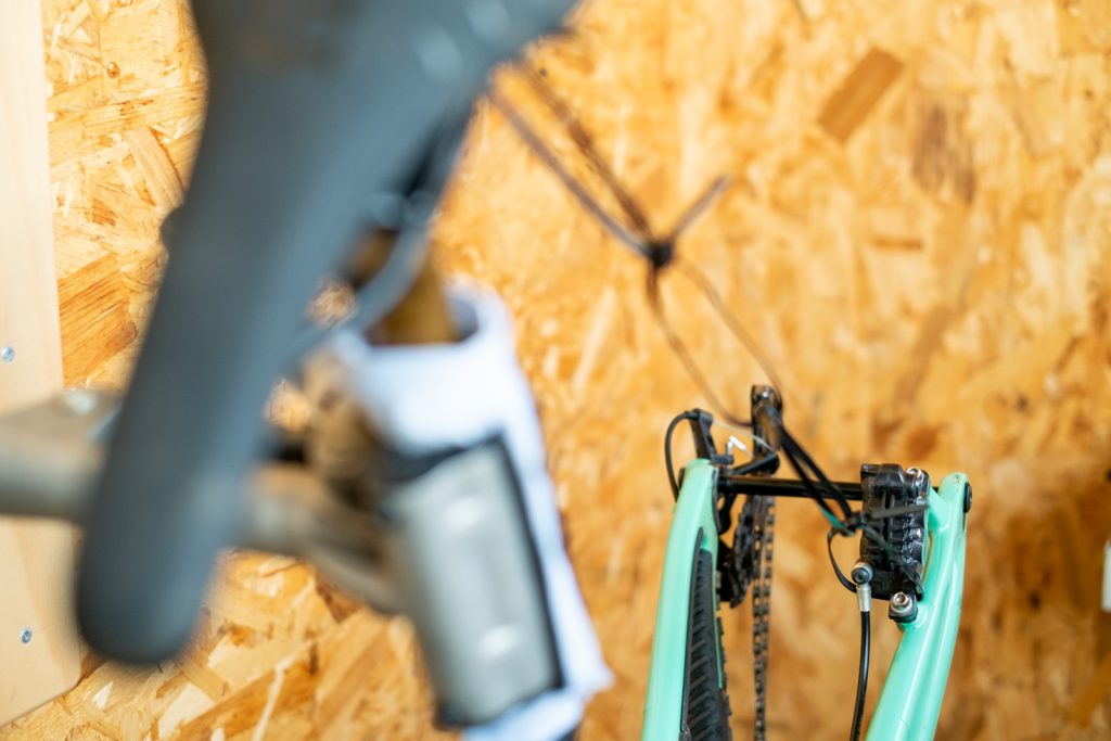 Nachdem du die Bolzen und Schrauben entfernt hast, hänge den Hinterbau mithilfe der Kabelbinder, Draht oder Schnur am Sattel auf und Schütze den Rahmen an den Kontaktstellen mit Papiertüchern oder Lappen gegen Kratzer. Achte darauf, dass die Leitungen nicht zu stark unter Spannung stehen.