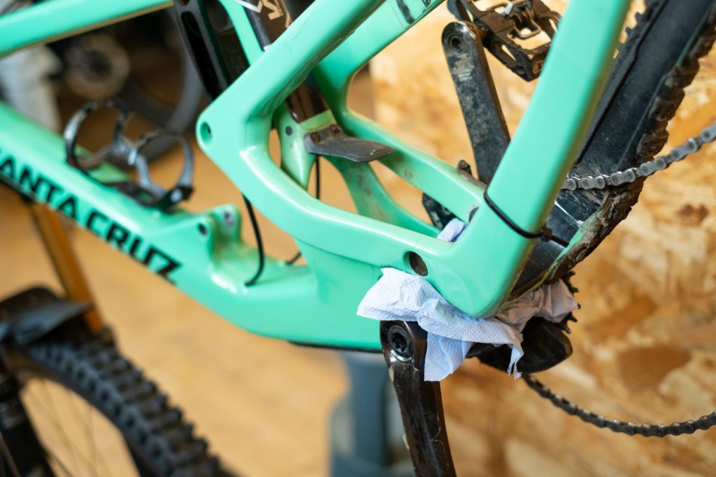 Um die beiden VPP-Links des Hinterbaus zu demontieren, in denen die Lager sitzen, entferne als erstes das Hinterrad und den Dämpfer aus deinem Rahmen. Schütze den Rahmen an möglichen Kontaktstellen zwischen durch Lappen oder Papiertuch.