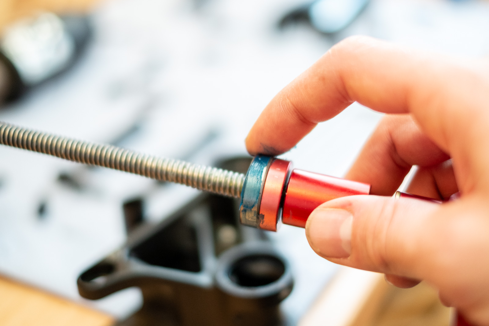 In diesem Schritt ist es wichtig, dass du alle Parts wieder in der richtigen Orientierung zusammensetzt. Die Lager der unteren Links besitzen eine offene und eine gedichtete Seite, damit das Fett durch den Schmiernippel bis zu den Kugeln des Lagers gelangt. Auch die Distanzhülse zwischen den Lagern sollte wieder so eingesetzt werden, wie du sie vorher ausgebaut hast.