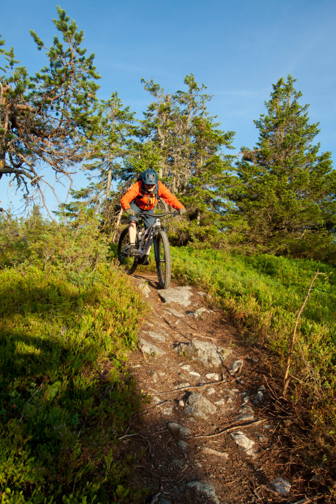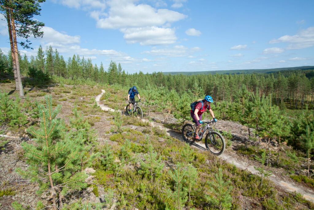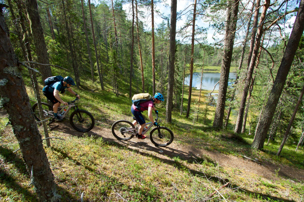 Wie gesagt: Nach unserer Stippvisite im Infocenter führt der Weg eigentlich nur noch zurück zum Basislager. Eigentlich. Denn es gilt zu berücksichtigen, dass unser Hotel genau auf dem Gipfel des höchsten Berges weit und breit thront. Und der ist immerhin 430 Meter hoch, was für finnische Verhältnisse eine seriöse Erhebung darstellt. Seriös genug für ein kleines Skigebiet, respektive einen Bikepark. Generell ist Finnland nämlich ziemlich flach. Plattgedrückt von den kilometerdicken Gletschern der Eiszeit. Der Eispanzer hinterließ mit Iso-Syöte nicht nur den südlichsten Fjell des Landes – so nennt man diese Inselberge -, sondern auch die angeblich 188.000 Seen. Wer auch immer die nachgezählt hat. Ehrlich gesagt sind wir während der finalen Höhenmeter heilfroh über unsere E-Bikes. Und das wird in den kommenden Tagen ähnlich sein. Denn so flach das Land wirkt, so fordernd sind seine Trails.