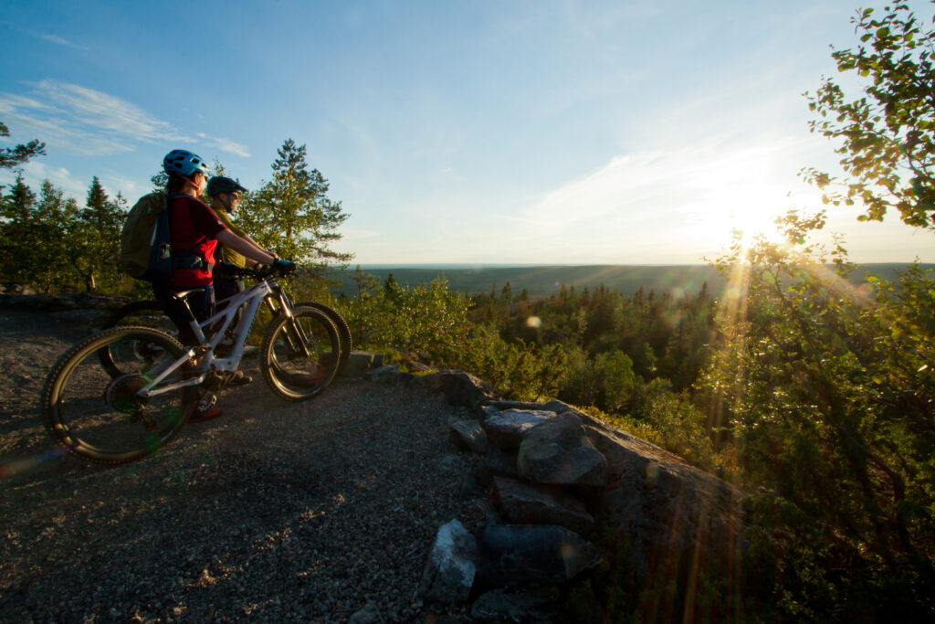 Während wir am späten Nachmittag hinauf zum Hotel schnaufen, steht die Sonne unverändert hell am Himmel. Über fünf Stunden haben wir für die gut 40 Kilometer im Sattel gesessen. Man muss in Finnland stets berücksichtigen, dass der extrem hohe Trail-Anteil mit unzähligen Geländewellen und Wurzelpassagen aufs Tempo drückt. Aber zum Glück kann man sich dank rund 22 Stunden Tageslicht in Iso-Syöte Zeit lassen. Gegen Mitternacht machen wir noch einen Spaziergang zum Berggipfel, um den nicht-enden-wollenden Sonnenuntergang zu genießen. Es liegt ein mystisches Licht über der Landschaft, als ließe der Himmel pures Gold über die Wälder fließen. Und selbst als der rote Glutball hinter den Horizont gerutscht ist, wird es nicht wirklich dunkel. Theoretisch könnten wir in zwei Stunden wieder aufs Bike steigen. Das ist es, was Finnland so faszinierend macht.
