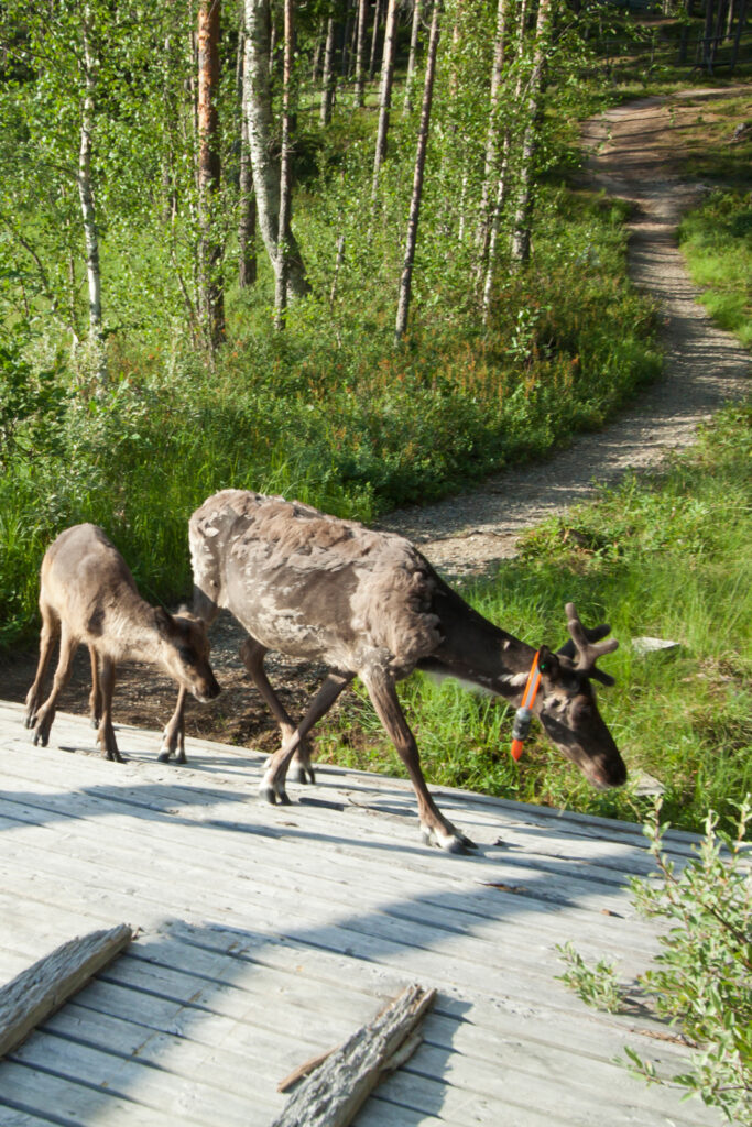 Als wir am nächsten Morgen starten, steht die Sonne bereits gefühlt im Zenith. Logisch, der Planet ist ja bereits seit zwei Uhr in der Früh wieder am Glühen. An diese endlos langen Tage im finnischen Mittsommer müssen wir uns wirklich erst gewöhnen. Auch der Auftakt der geplanten 40-km-Runde ist etwas Besonderes, in zweierlei Hinsicht: Zuerst schießen wir in feinster Downhill-Manier durch den Park, hinunter an den Fuß des Bergs. Dann lotst uns Pekka über einen neuen, typisch finnischen Streckenabschnitt, wo wir auf schmalen Holzplanken ein Moor durchqueren. Ein Balanceakt, der volle Konzentration erfordert. Nach einer Kletterpassage über den benachbarten Skiberg Pikku-Syöte lassen wir die Zivilisation hinter uns. Es ist ein ungewohntes Gefühl, stundenlang keinen Menschen zu treffen. Die Orientierung haben wir in den endlosen Wäldern längst verloren, wären da nicht die farbig markierten Pfade, die uns geleiten. Mal sandig, mal auf weichem Waldboden, mal über holprige Wurzelteppiche. Dennoch geht selbst Pekka nie ohne GPS-Gerät auf Tour, und das, obwohl er die sporadisch am Weg stehenden Schilder mit unaussprechlichen Hinweisen und Ortsnamen versteht. Für uns wird die Kommunikation ein Rätsel bleiben, denn Finnisch zählt weltweit zu den am schwierigsten zu erlernenden Sprachen. Säkkisenlammit, Puolivälinlampi, Niskavaara, Kellarilampi – immerhin wissen wir gegen Ende der Trailrunde, dass letzteres ein See ist. Kreuz und quer liegen unsere Bikes auf dem Holzsteg, während wir im glasklaren Wasser planschen. Laut Pekka gehört in Finnland ein Bad zu einer Biketour. So, wie die Begegnung mit Rentieren.