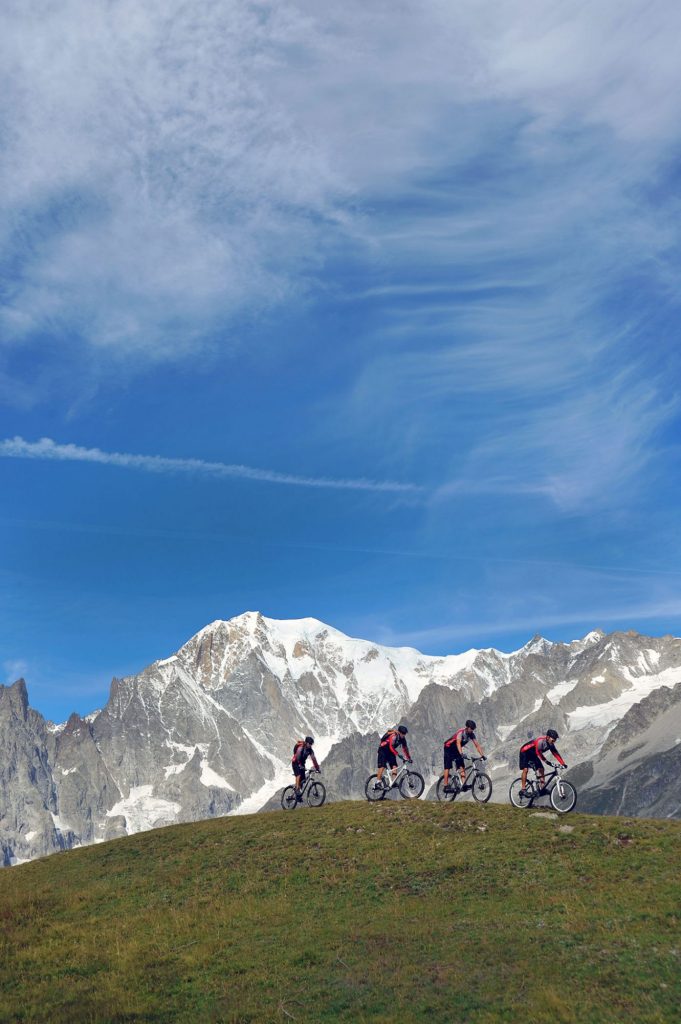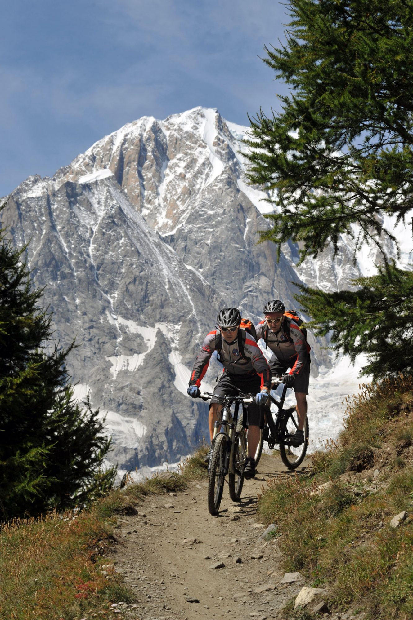 Die Touren rund um La Thuile und Courmayeur gehören zum Pflichtprogramm im Aostatal, schon wegen der Blicke zum vergletscherten Mont Blanc. Unser Tipp: Von Pré-Saint-Didier über La Thuile zum Col des Chavannes (2592 m). Nach der langen aber relativ einfachen Auffahrt ausgiebig den Mont Blanc bewundern! Dann auf epischem Singletrail ins Val Veny (oben ausgesetzt!), und talauswärts über Courmayeur zurück zum Start.