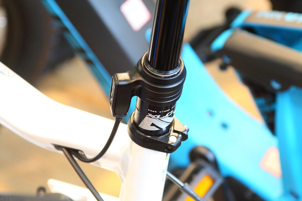 Vario-Stütze an einem Haibike mit externer Zug-Anlenkung. Bei fehlenden Öffnungen im Rahmen kann man den Zug auch außen am Oberrohr entlang legen.