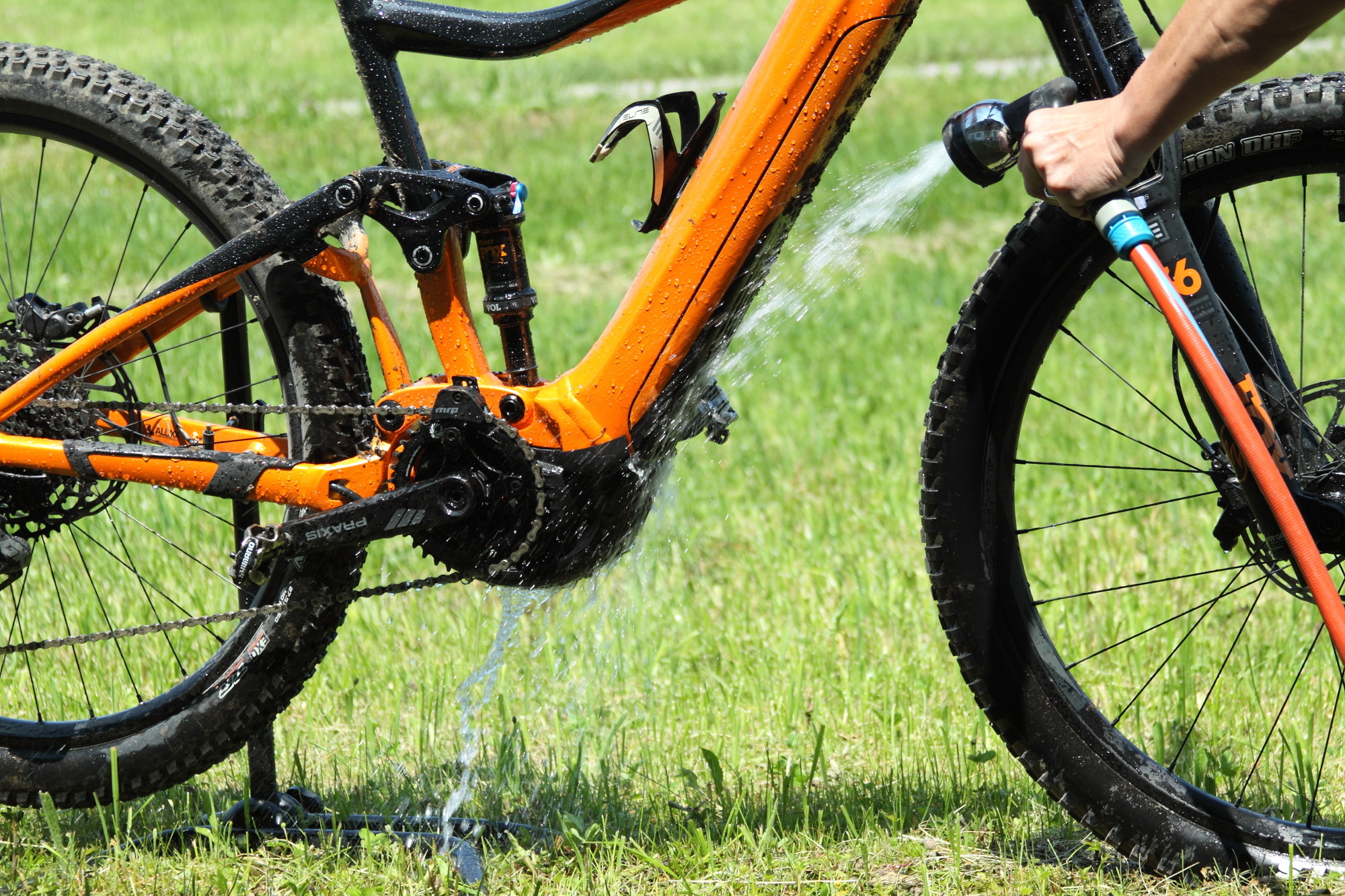 Während der Reinigung des E-Bikes (was man nach regelmäßig tun sollte!) sollte man den Akku heraus nehmen. Es genügt, ihn mit einem feuchten Tuch abzuwischen. Lauwarmes Wasser mit Fahrradreiniger löst gröbere Verschmutzungen. Achtung, aggressive Reinigungsmittel können die Kunststoffhülle angreifen! Zum Abspritzen des E-Bikes bitte einen weichen Wasserstrahl verwenden. Hin und wieder sollten auch die elektrischen Kontakte gesäubert und leicht gefettet werden.