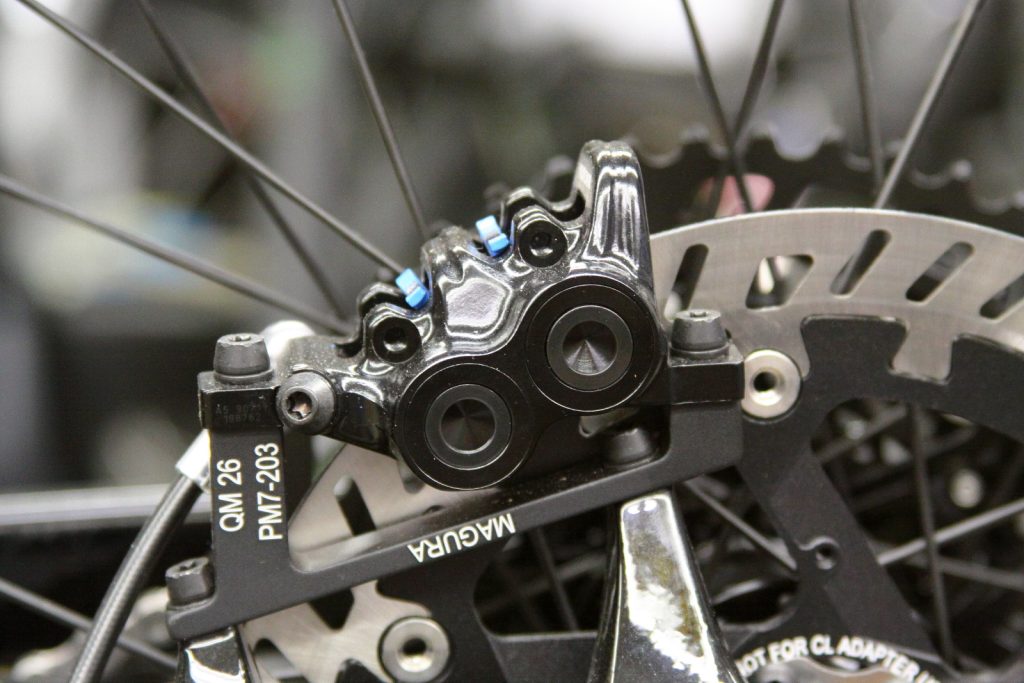 Scheibenbremsen mit 4-Kolben-Sätteln sind gegenüber Modellen mit nur zwei Kolben auf jeden Fall vorzuziehen. Denn hier üben mehr Kolben mehr Druck auf die Scheibe aus, was eine höhere Reibung verursacht. Du erkennst eine 4-Kolben-Bremse an den doppelt vorhandenen, nebeneinander liegenden runden Verschlussdeckeln. Im Bild am Beispiel der Magura MT5. Der schwäbische Hersteller hat mit der brandneuen eSTOP sogar eine spezielle E-Bike-Scheibenbremse im Programm. Achtung: Bei manchen anderen Herstellern ist die Anzahl der Kolben nur auf der den Speichen zugewandten Innenseite des Sattels zu erkennen.
