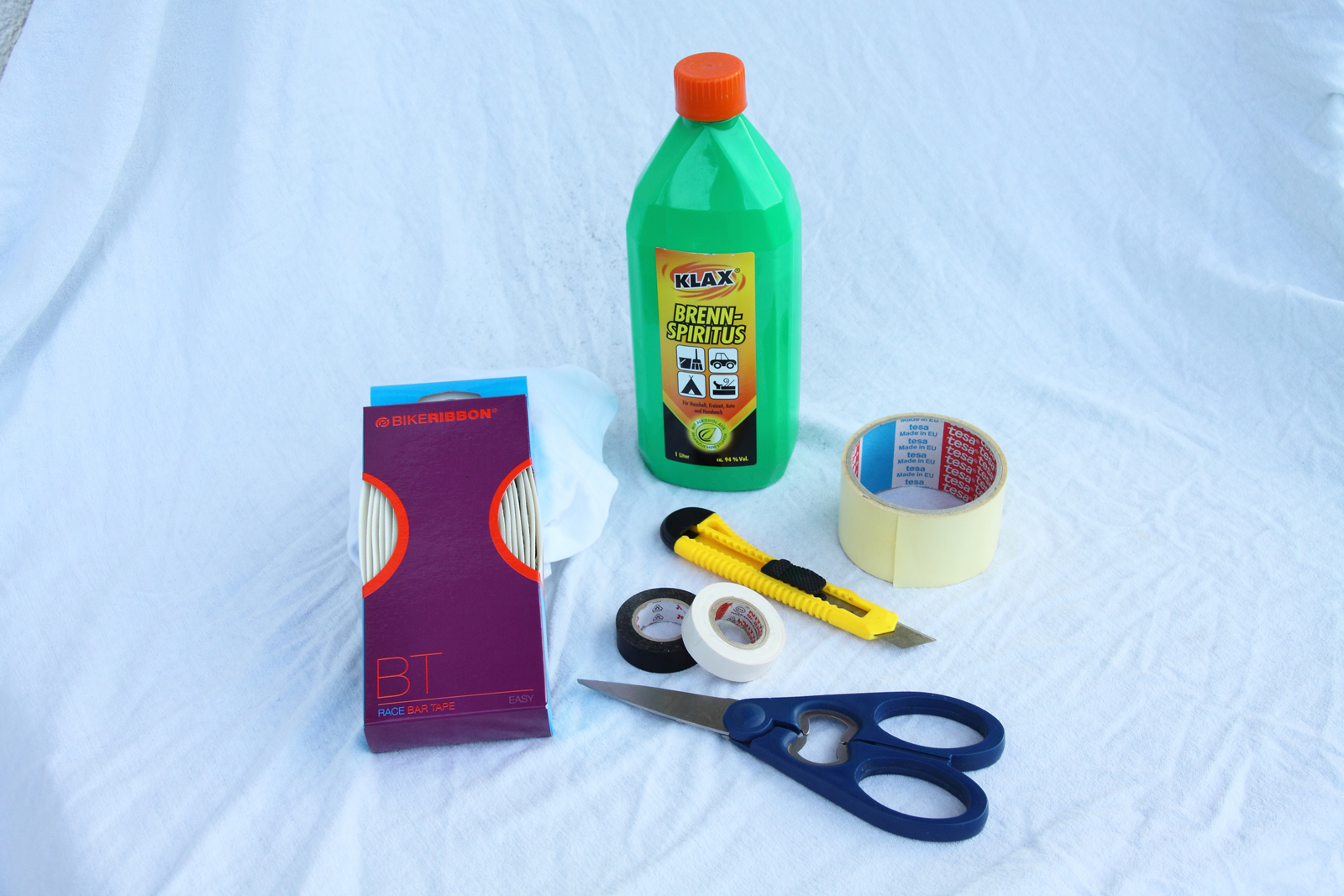Folgendes Werkzeug und Material solltest du am Start haben: 1. Das gewünschte Lenkerband. Im Set enthalten sind zwei lange Abschnitte für die Lenkerhälften. Zwei kurze Segmente zur Abdeckung der Bremsgriff-Befestigungsschellen. Zwei Abschluss-Klebebänder und zwei Lenker-Endstopfen. 2. Reiniger zum Entfetten der Lenkeroberfläche. 3. Doppelseitiges Klebeband (für den Notfall). 4. Ein Teppichmesser zum Abschneiden des alten Bandes. 5. Isolierband in gewünschter Farbe. Für den Fall, dass die Züge am Lenker fixiert werden müssen. Oder kein Abschluss-Klebeband im Set enthalten ist. 6. Eine Schere.