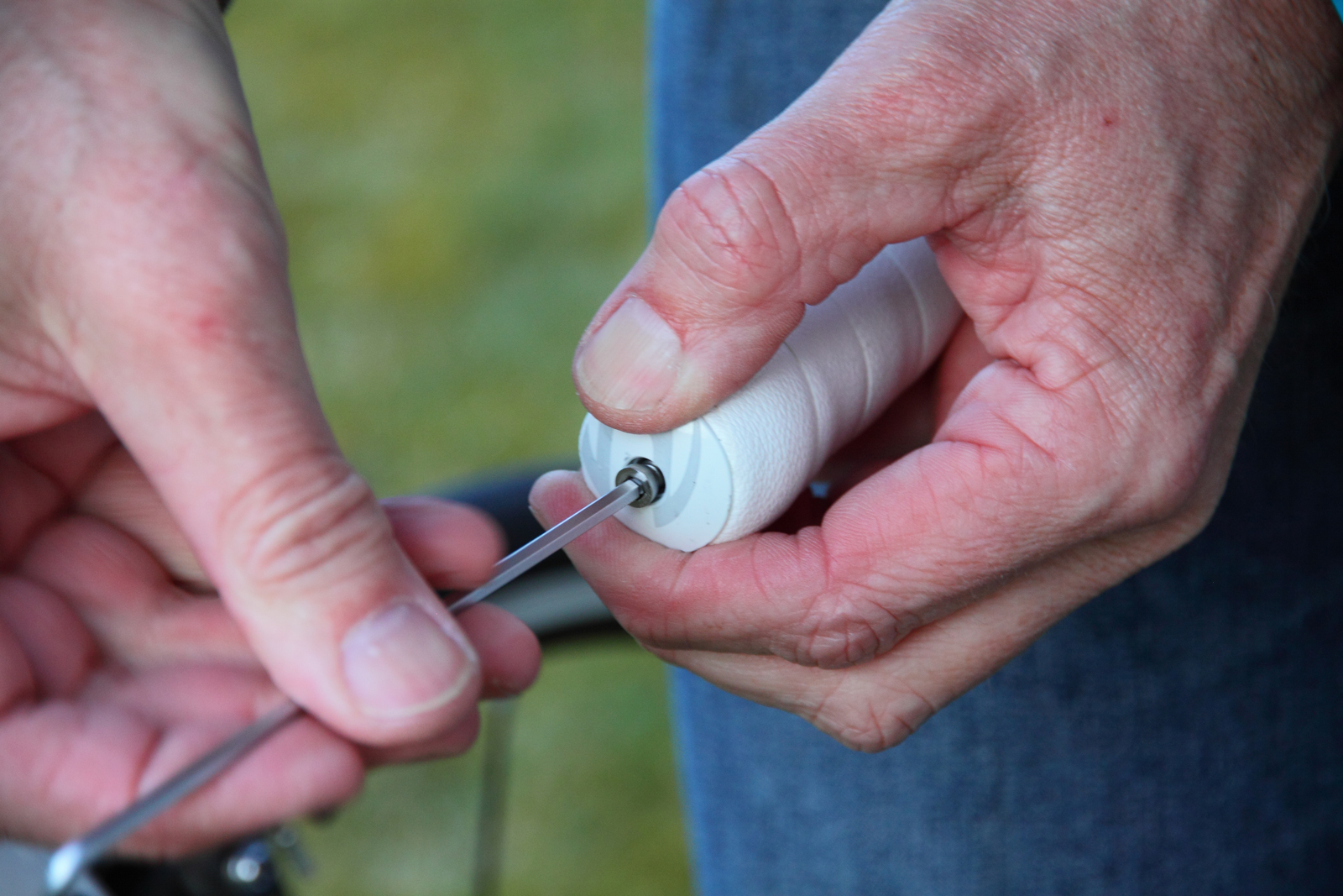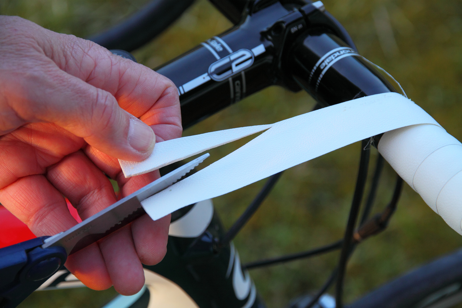 Bevor du das alte Lenkerband entfernst, musst du die Griffgummis nach vorne stülpen. Wenn sich das alte Lenkerband schwer abwickeln lässt, kann man es mit Hilfe des Teppichmessers vorsichtig der Länge nach aufschneiden. Am besten an der Unterseite neben den Zügen, wo es nicht direkt am Metall aufliegt. Unbedingt mit äußerster Vorsicht arbeiten und nur soweit einschneiden, dass das Band durchtrennt wird. Bei empfindlichen Karbon-Lenkern bitte auf diese Methode verzichten!